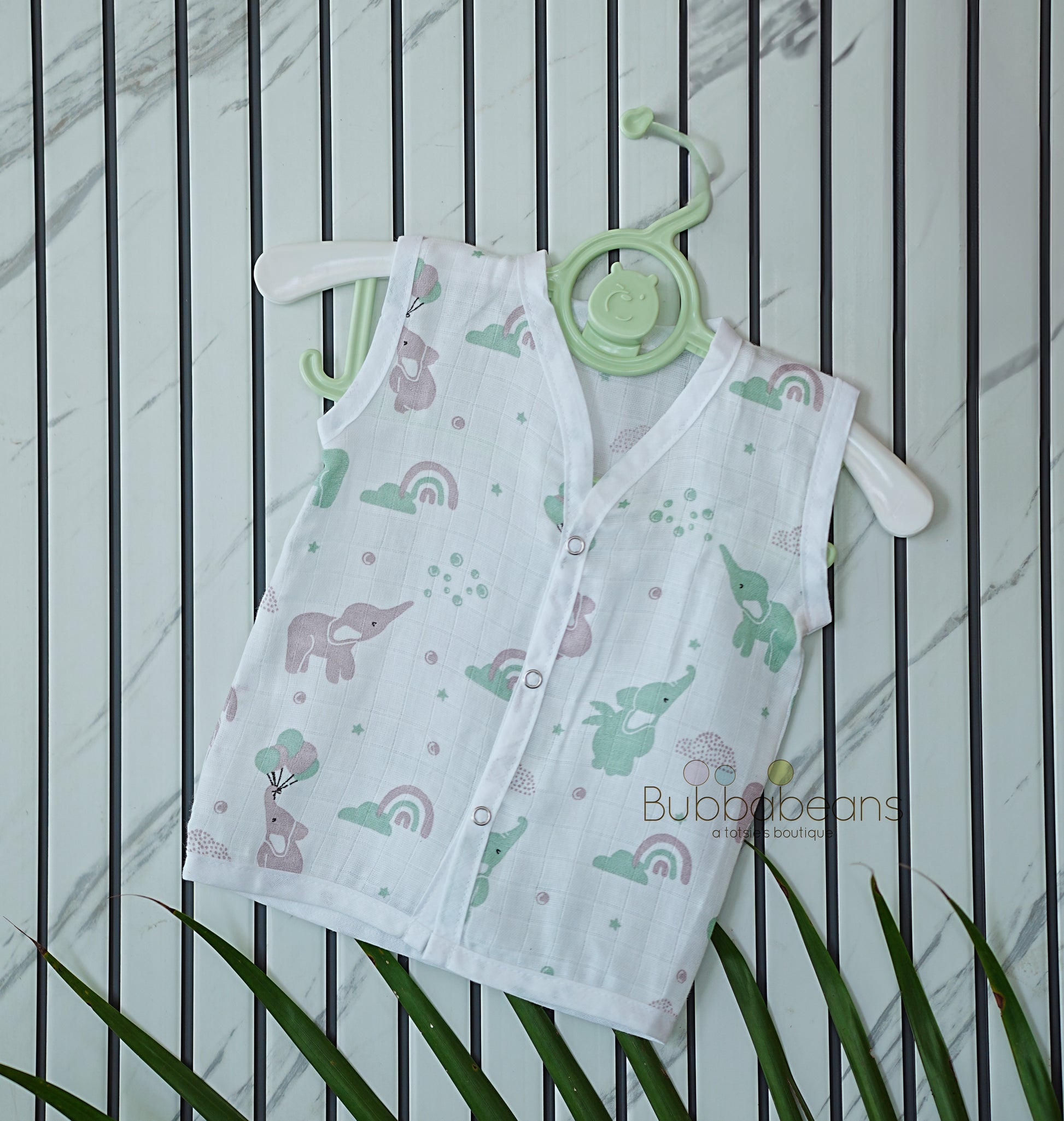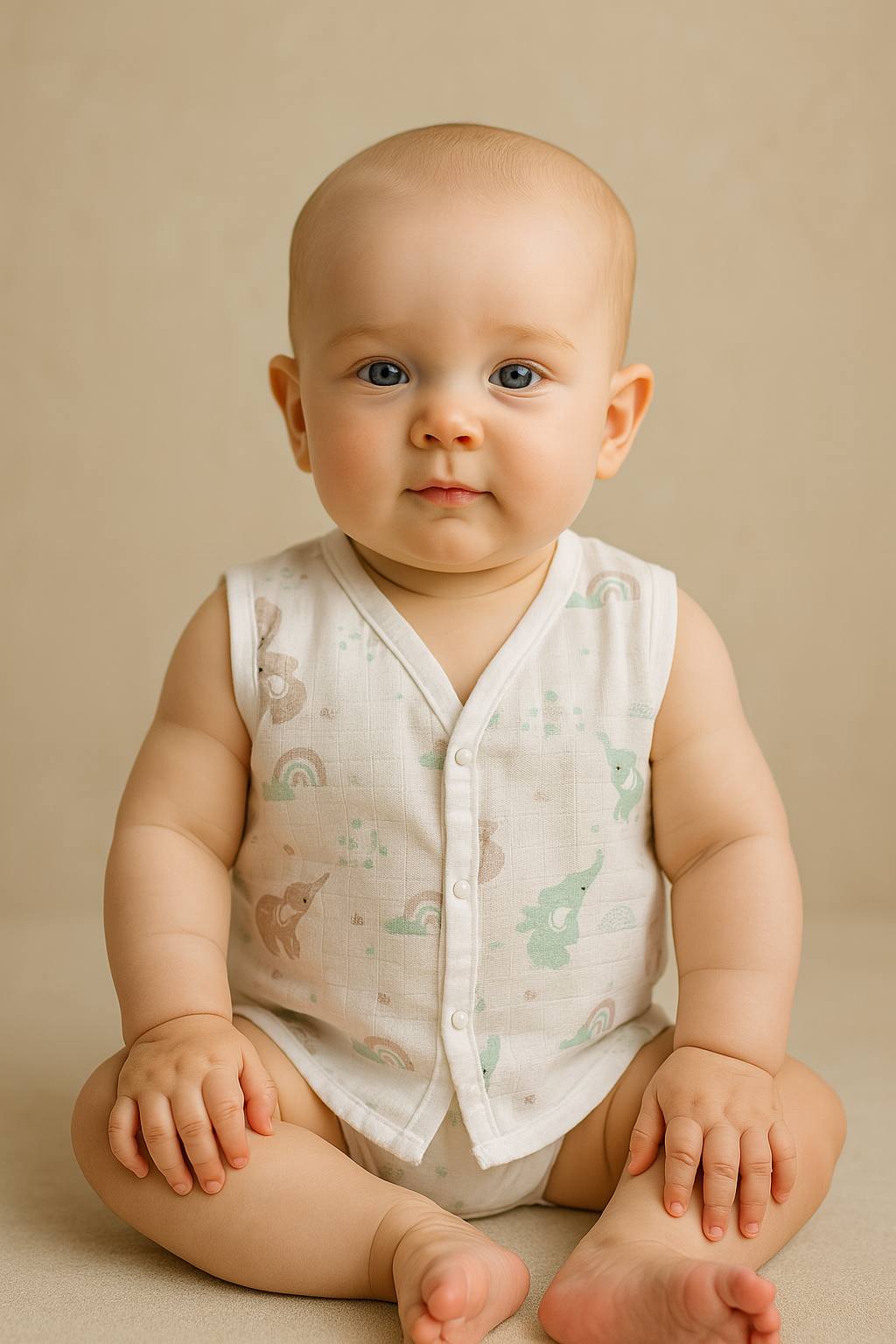 Set off on a playful safari with our Elephantine Adventures Muslin Jhabla. Crafted from ultra-soft, breathable muslin cotton, this sleeveless vest features adorable pastel elephant, rainbow, and star prints that add a charming touch to your baby’s everyday wardrobe. The lightweight, skin-friendly fabric keeps your little one cool and comfortable, while the easy front snap button closure makes dressing quick and fuss-free. Perfect for warm days or layering with cozy essentials.