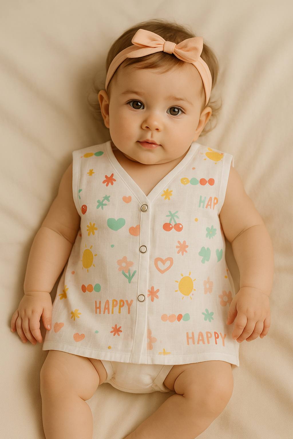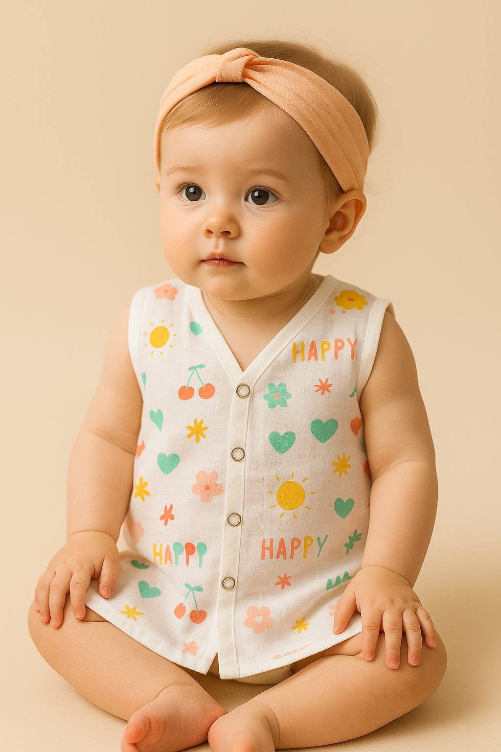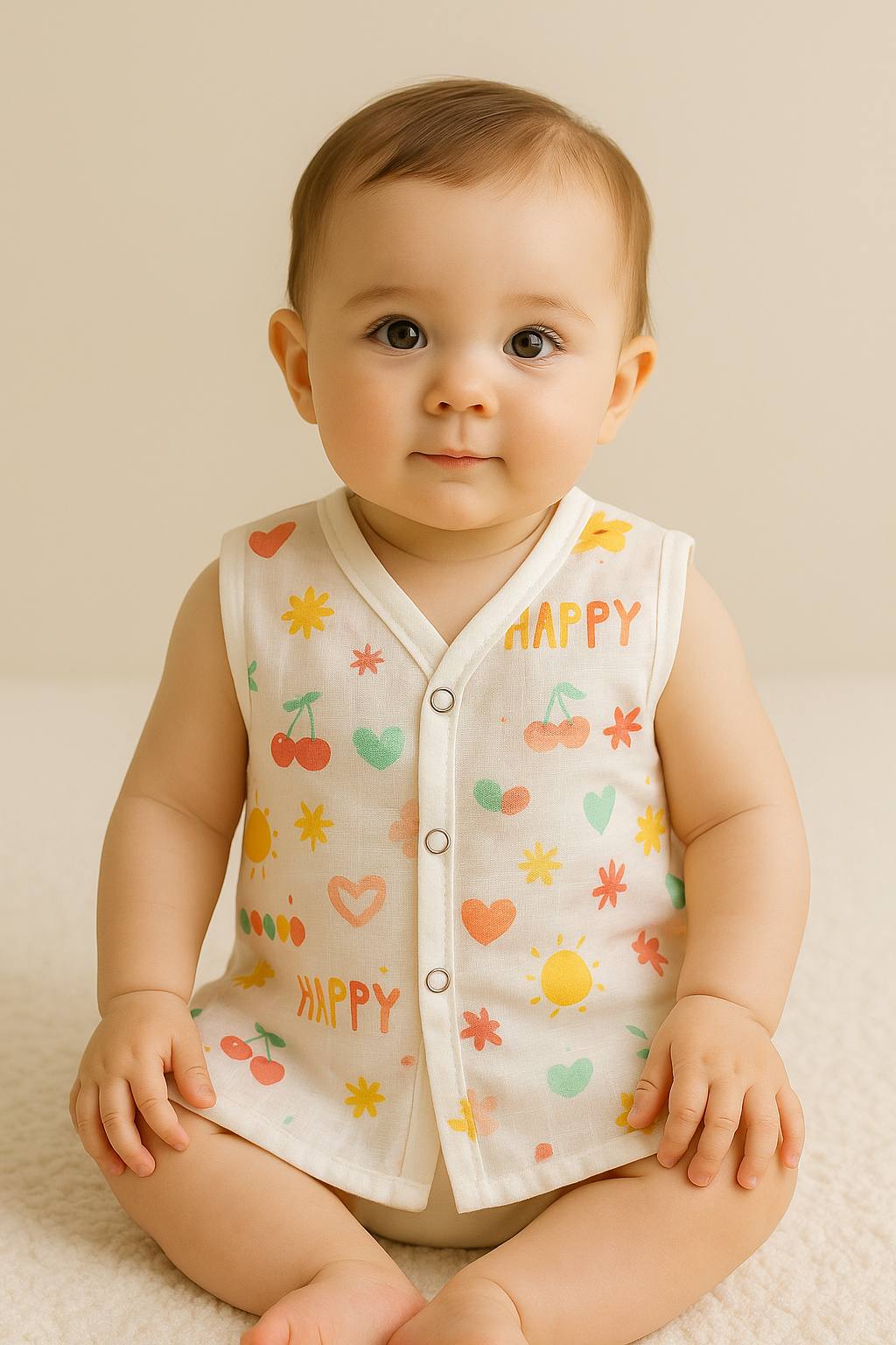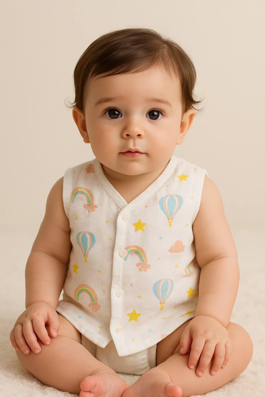Bring a burst of joy to your babyβs wardrobe with our Happy Days Muslin Jhabla! π This sleeveless, ultra-soft muslin vest is adorned with playful suns, cherries, hearts, and cheerful βHAPPYβ prints in soothing pastel shades. Thoughtfully designed for ultimate comfort and breathability, it keeps your little one cool and cozy all day long.