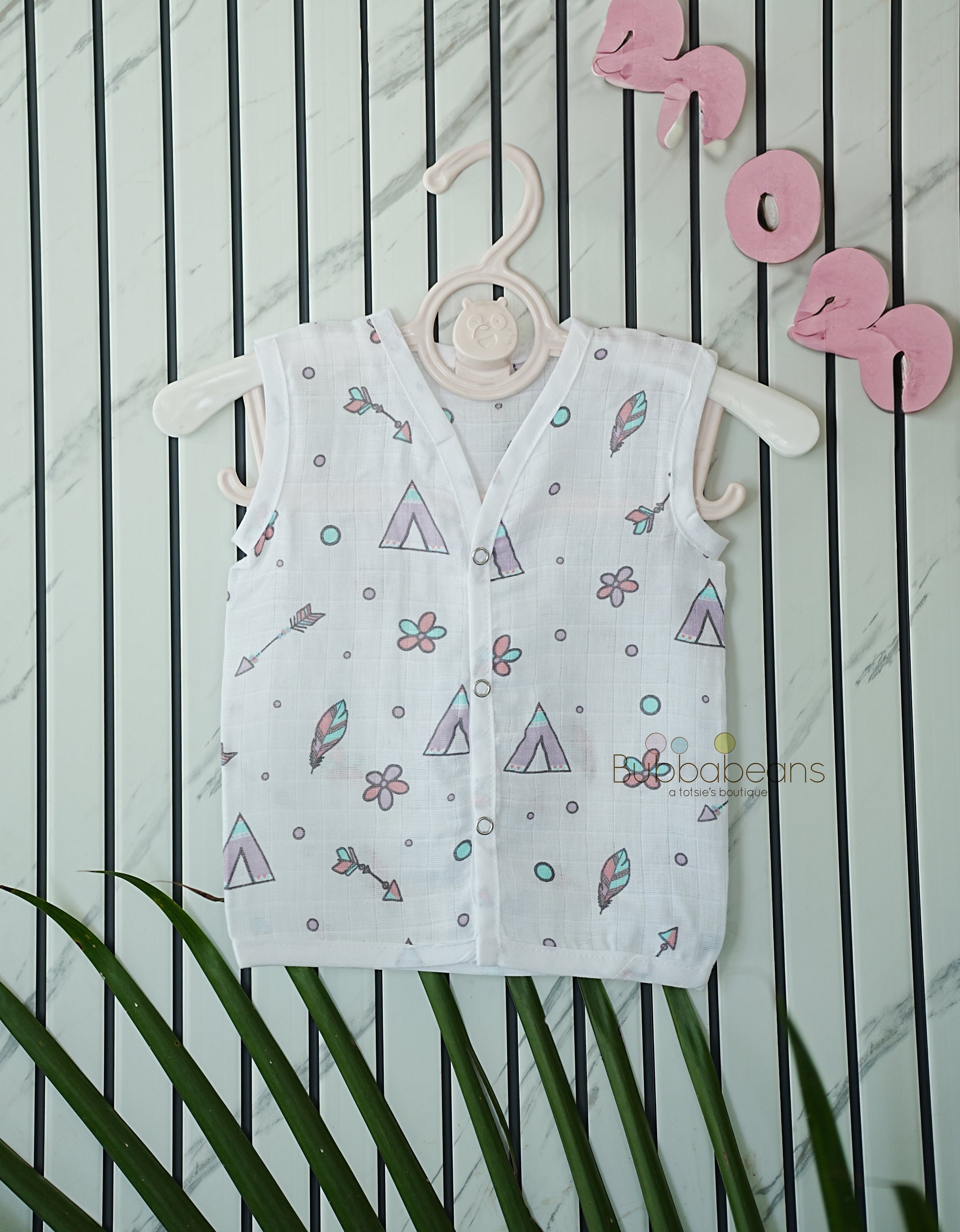 Bring a playful twist to your baby’s wardrobe with our Whimsical Wonders Muslin Jhabla. Made from ultra-soft, breathable muslin cotton, this sleeveless vest features delightful pastel teepee tents, feathers, arrows, and floral prints to spark your little one’s imagination. Gentle on delicate skin and lightweight for everyday comfort, it’s perfect for warm weather or layering. Designed with front snap buttons for easy dressing, this adorable jhabla combines practicality with style.